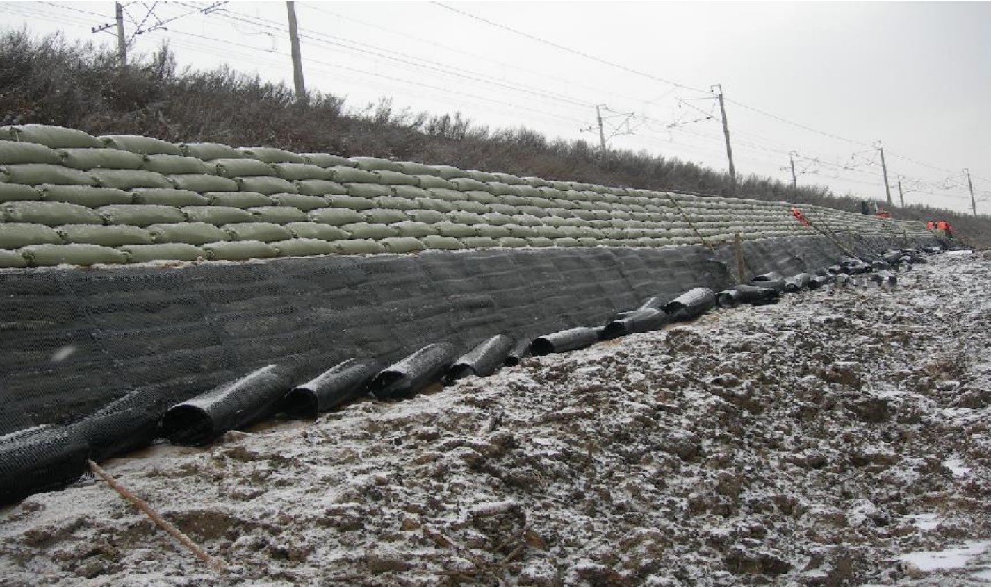 Состав АГН: одноосная георешетка СО, полотно нетканное иглопробивное, геомат, тканный текстиль.